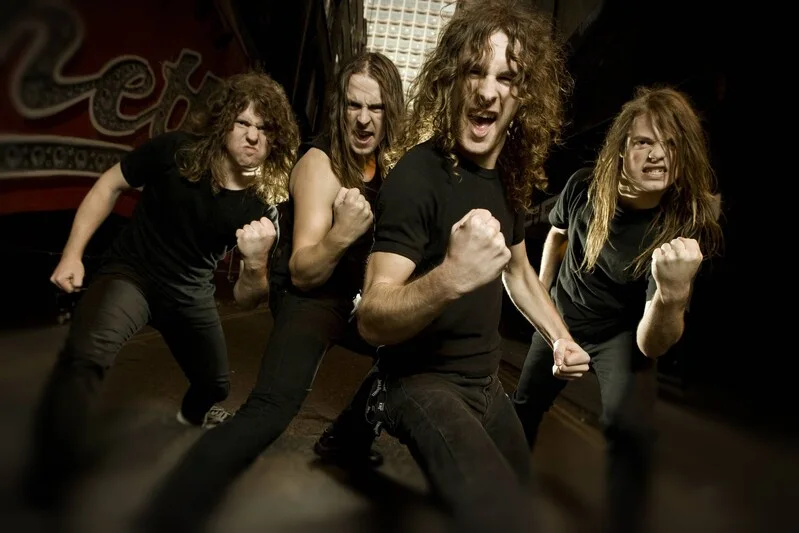 Posed group portrait of Australian rock band Airbourne. Left to right are David Roads, Ryan O'Keeffe, Joel O'Keeffe and Justin Street in London, England on February 18 2008. (Photo by Nigel Crane/Redferns)