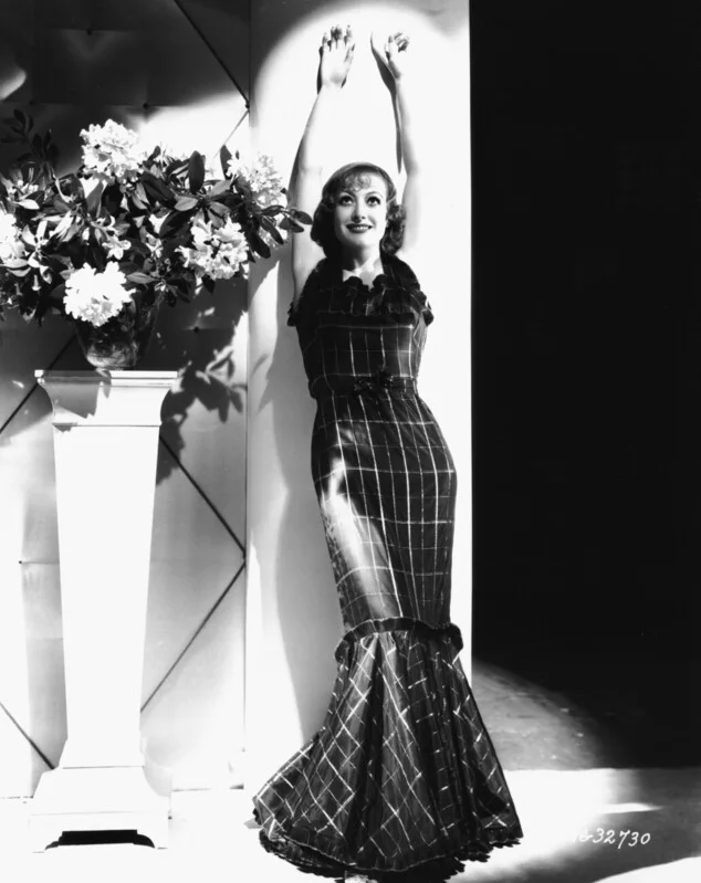 Portrait of actress Joan Crawford wearing a long, checked dress, with her arms above her head, and standing next to a vase of flowers, circa 1935. (Photo by Archive Photos/Getty Images)