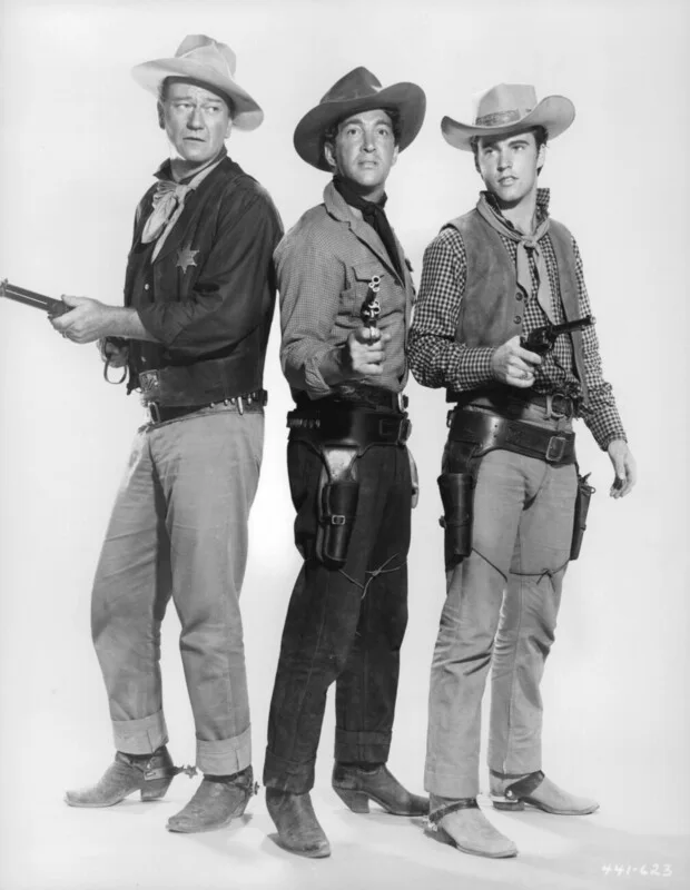 John Wayne and Dean Martin stand back to back with guns drawn in a scene from the film 'Rio Bravo', 1959. (Photo by Warner Brothers/Getty Images)