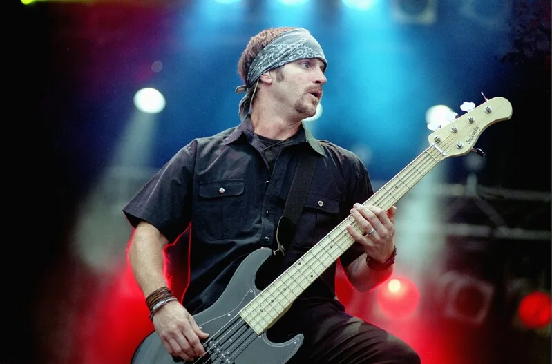 NETHERLANDS - JUNE 04: PINKPOP FESTIVAL Photo of ALTER BRIDGE, Alter Bridge, Pinkpop, Landgraaf, Nederland, 04 juni 2006, Pop, grunge, rock, de bassist draagt een hoofddoek en plukt de bas en op de achtergrond zie je mooie blauwe en rode lichtbundels (Photo by Peter Pakvis/Redferns)