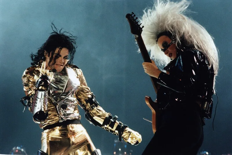 NETHERLANDS - JUNE 01: Photo of Michael JACKSON and Jennifer BATTEN; Michael Jackson with Jennifer Batten performing live on stage at the Amsterdam Arena - HIStory Tour (Photo by Michel Linssen/Redferns)
