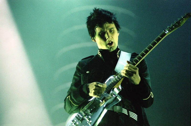 NETHERLANDS - AUGUST 20: LOWLANDS FESTIVAL Photo of MUSE, Muse, Lowlands, Biddinghuizen, Nederland, 20 augustus 2006, Pop, gitaar, de zanger speelt op zijn gitaar, op de achter-, grond zie je groene en witte lichtbundels schijnen en, enkele spiraalvormen zijn latent op het podium aanwezig (Photo by Peter Pakvis/Redferns)