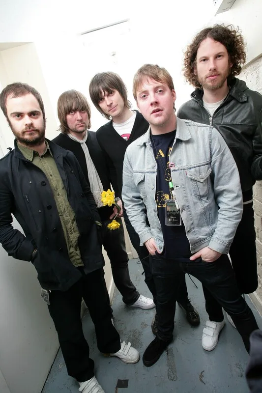 UNITED KINGDOM - MARCH 07: GLASGOW ACADEMY Photo of Simon RIX and Ricky WILSON and Nick HODGSON and Nick BAINES and KAISER CHIEFS and Andrew WHITE, Nick 'Peanut' Baines, Andrew 'Whitey' White, Nick Hodgson, Ricky Wilson, Simon Rix - posed, group shot, backstage (Photo by Mick Hutson/Redferns)