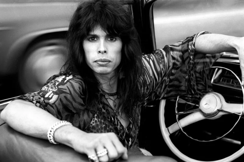 Steven Tyler of rock group Aerosmith in his 1956 Mercedes Benz 220S at Jamaica Pond, Boston MA October 9, 1975