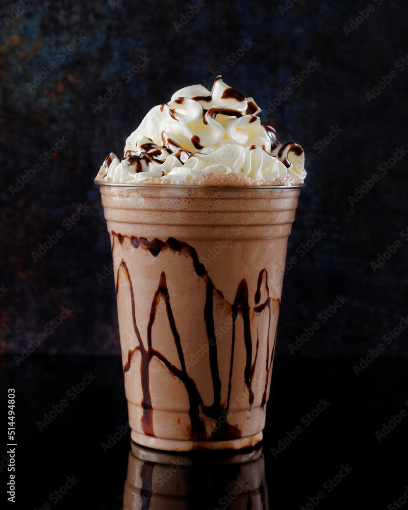 Fotografija Chocolate milkshake served in a clear glass on a dark background