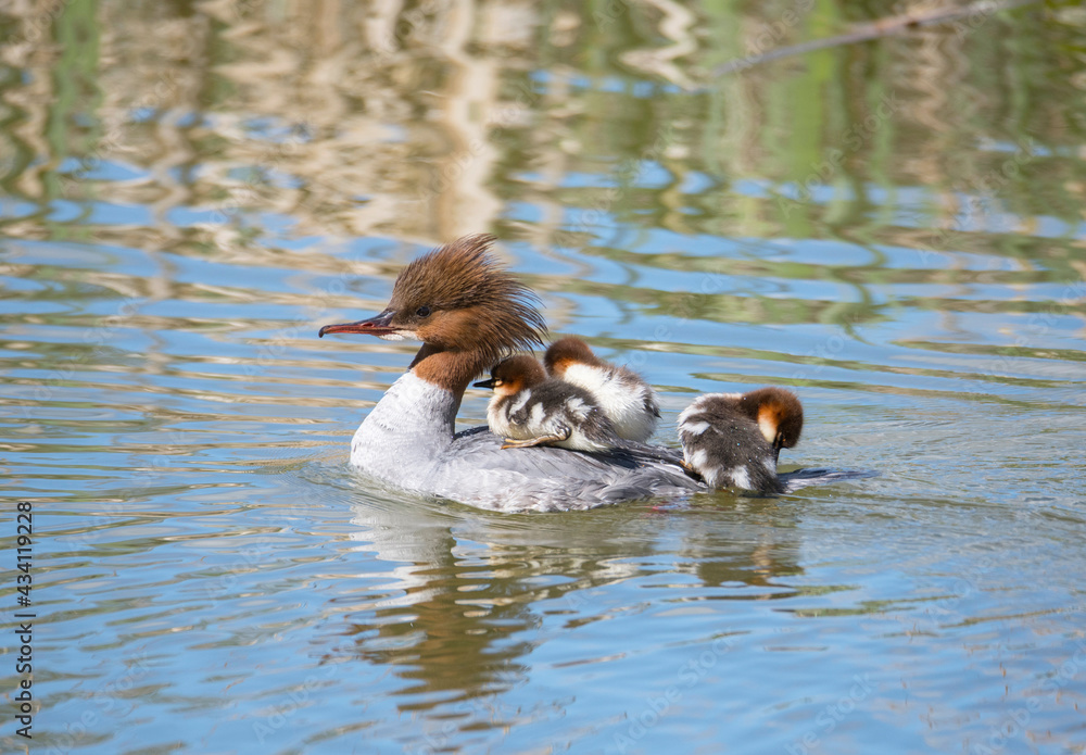 Fotografija Common merganser with chicks in a pond on the Drottningholm island in Stockholm