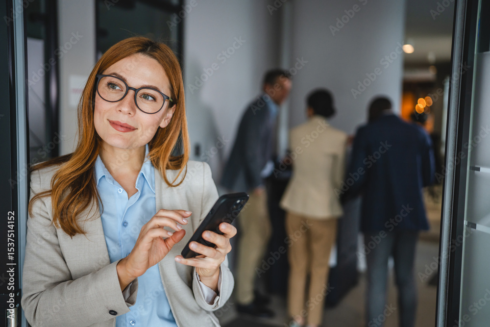 Fotografija Confident smile adult businesswoman use mobile phone on break