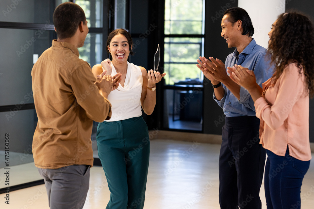 Tapeta Business team celebrating colleague receiving award in modern office setting