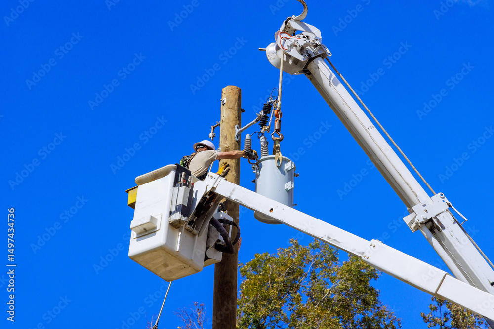 Tapeta Utility worker is repairing equipment on power lines from lift truck under clear blue sky
