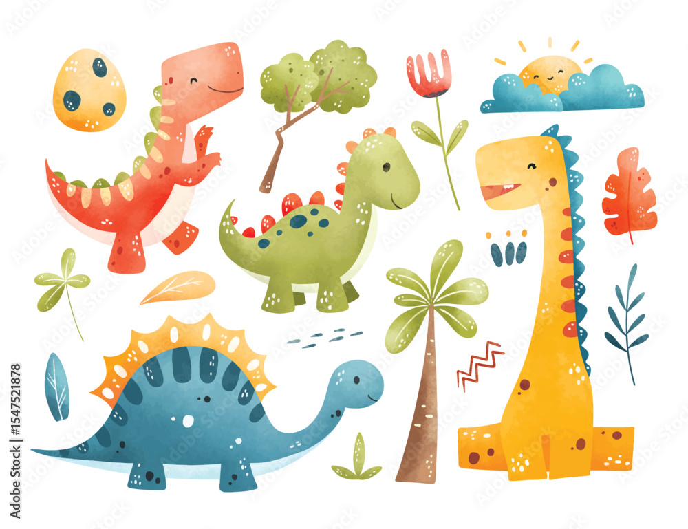 Tapeta Watercolor Illustration Set of Happy Dinosaurs and Nature Elements