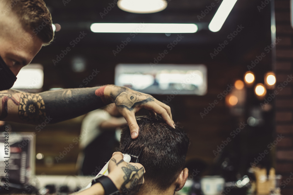 Tapeta Crop tattooed stylist concentrated on shaving man with machine doing hairstyle