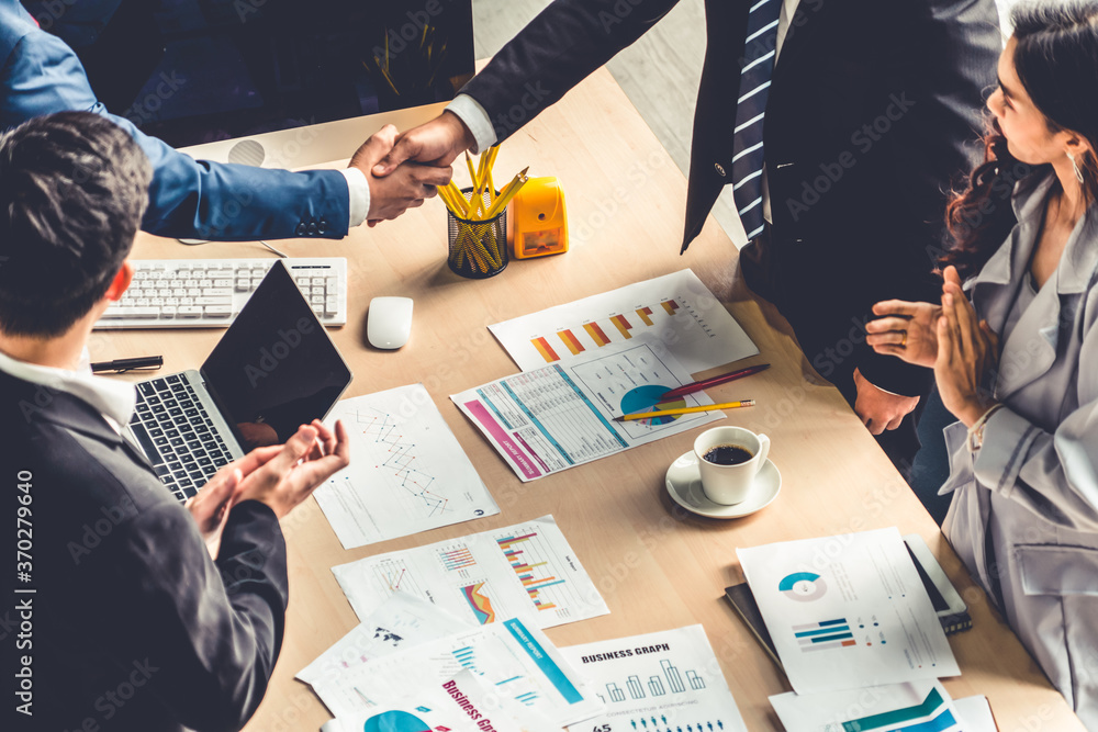 Tapeta Group business people handshake at meeting table in office together with confident shot from top view