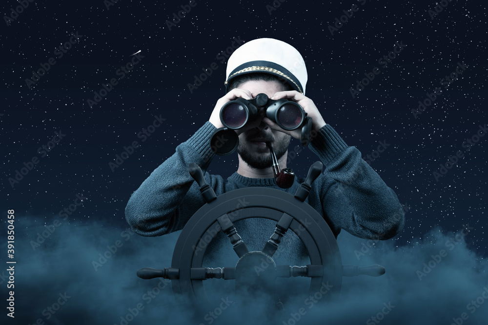 Tapeta helmsman with binoculars and cap over clouds viewing to the starry sky