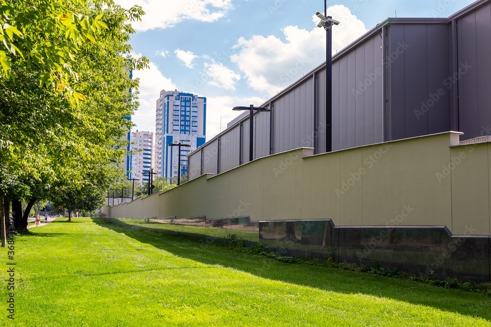 Slika na platnu Green grass lawn and secured high fenced area with secutity cctv cameras ofresidential apartment , office of industrial building