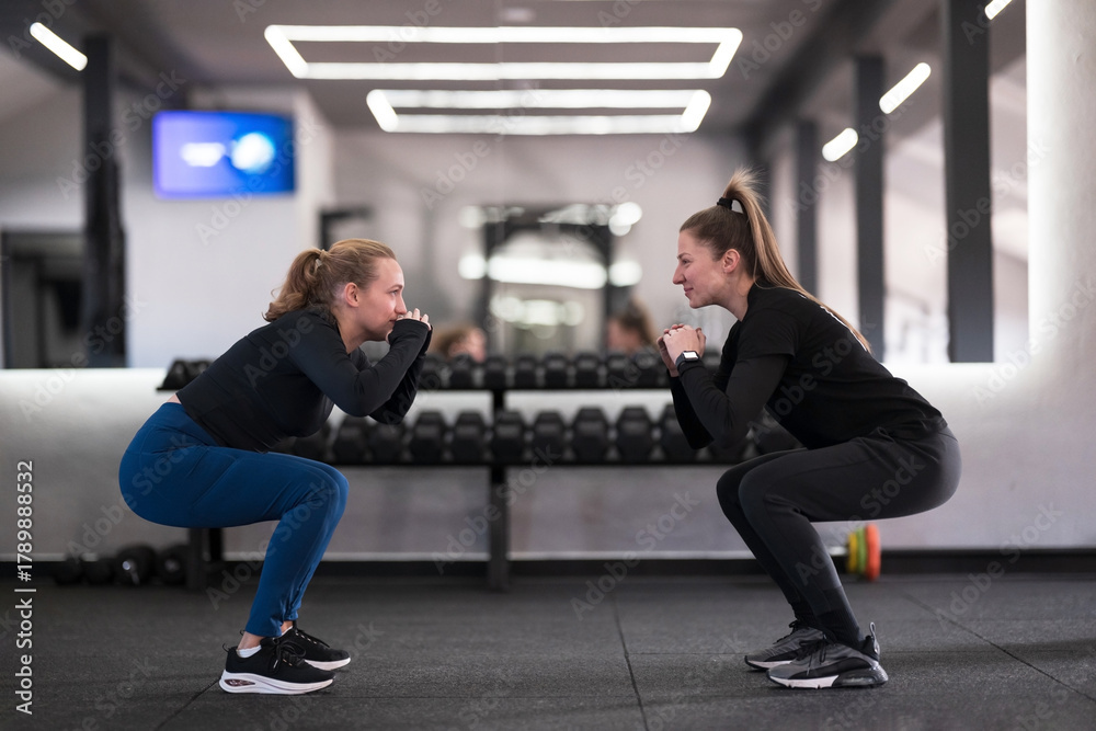 Fotografija Two women perform squats together in a modern gym during a fitness session focus