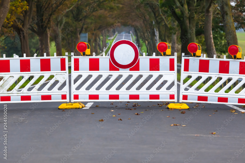 Fotografija Closed Forbidden Road / Red and white colored street barrier on closed avenue ro