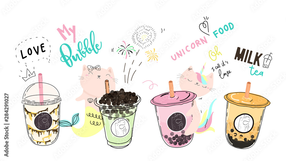 Fotografija Bubble tea cup design collection,Pearl milk tea , Yummy drinks, coffees and soft drinks with doodle style banner