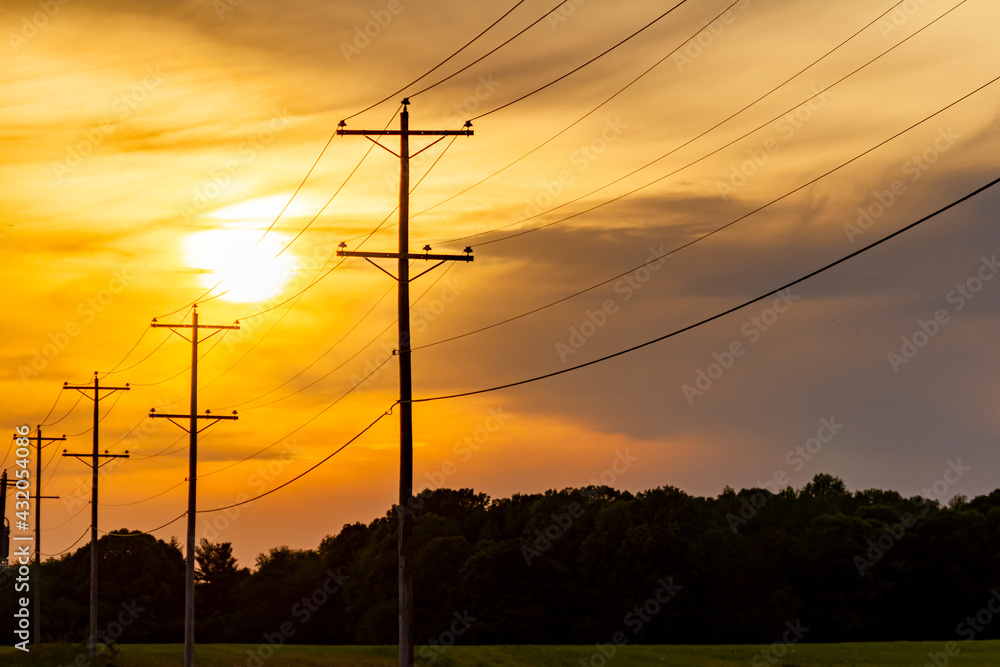Fotografija Silhouettes of utility poles carrying high voltage electricity alongside a road at a rural area