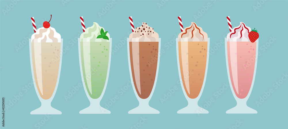Fotografija Set of different milkshakes in glasses. Vector illustration.