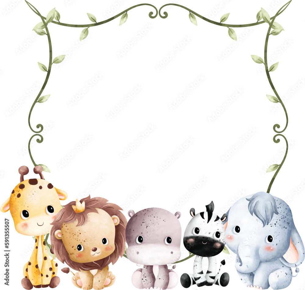 Fotografija Watercolor Illustration tropical leaves wreath frame with cute baby animals