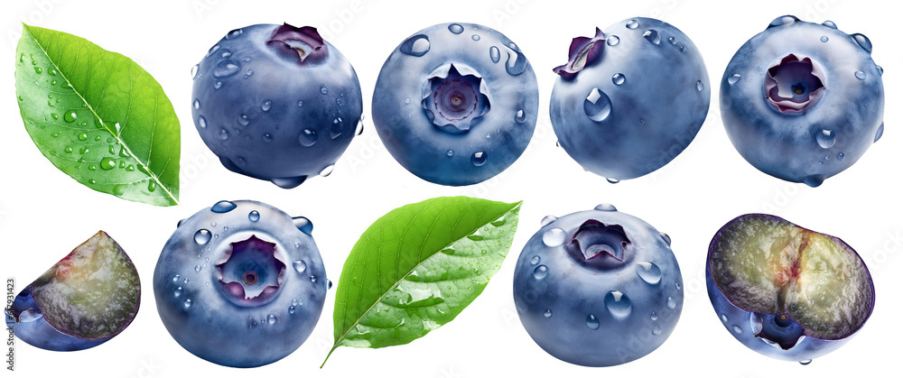 Fotografija Set of bog bilberries with bloom and drops and two leaves of bog whortleberry isolated on a transparent background