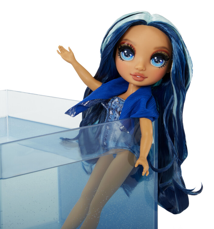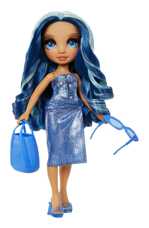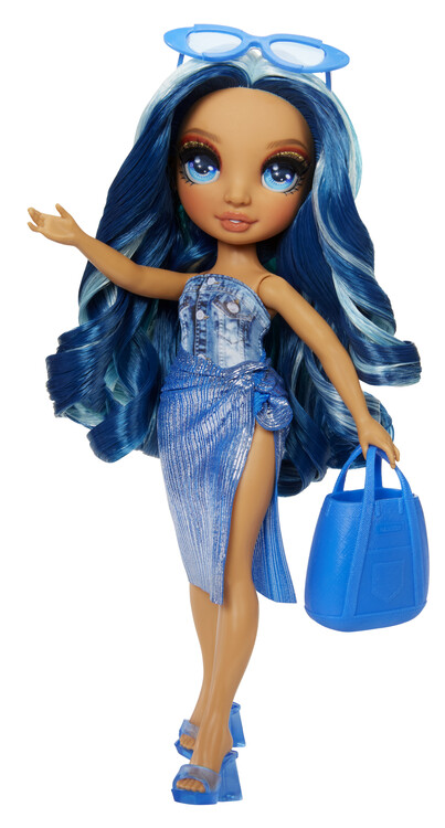 Set uključuje modnu lutku, odvojivi kupaći kostim, par lutkinih sandala, svjetlucavi omot, sunčane naočale i torbu.