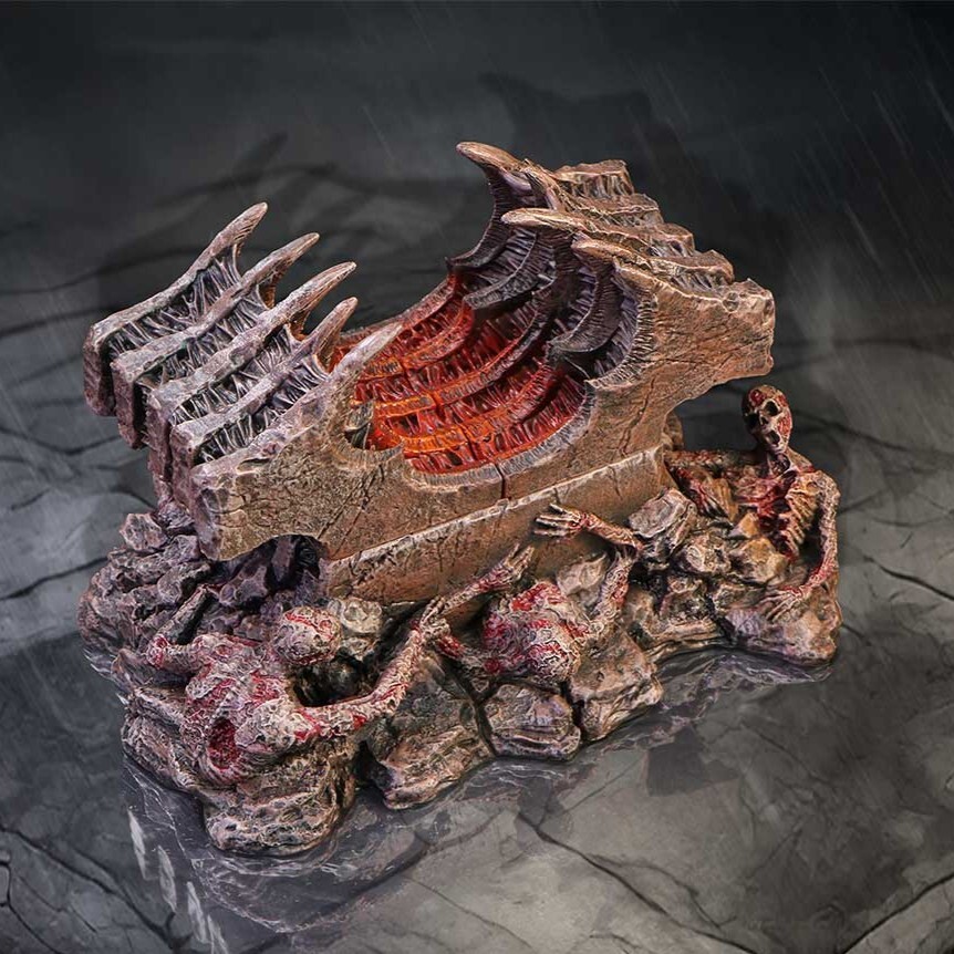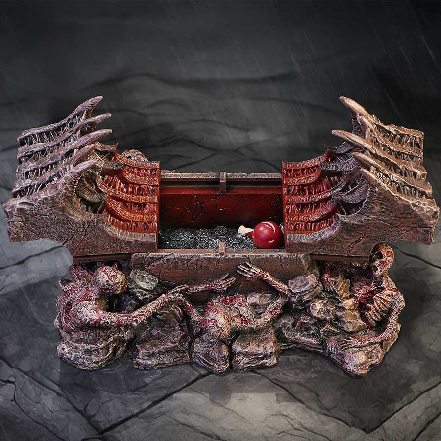 Službena Diablo škrinja za pohranu, ručno oslikana, s poklopcem na pant, detaljnom unutrašnjosti i „hell-forged” motivom na vrhu. Praktičan dodatak za kockice i žetone.