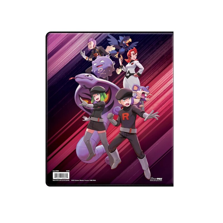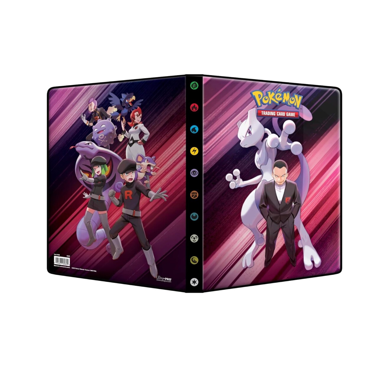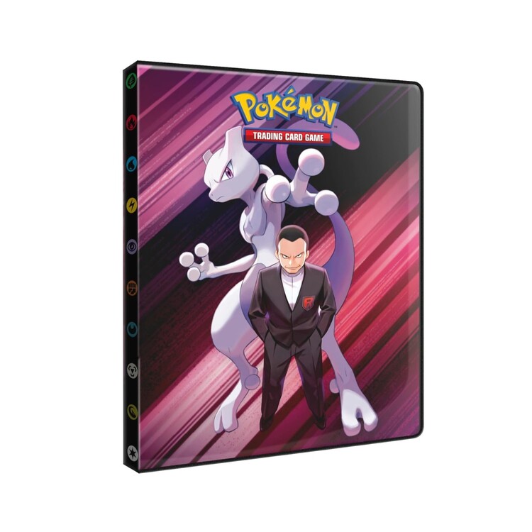 Službeno Pokémon TCG portfelj-album s 9 džepova s full-art ilustracijom Giovanni & Mewtwo i stražnjom stranom Team Rocket (Murkrow, Koffing, Arbok, Rattata). Sadrži 14 prozirnih stranica bez PVC-a i kiselina za 126 kartica jednostrano ili 252 obostrano. Proizvedeno u Kaliforniji (SAD).