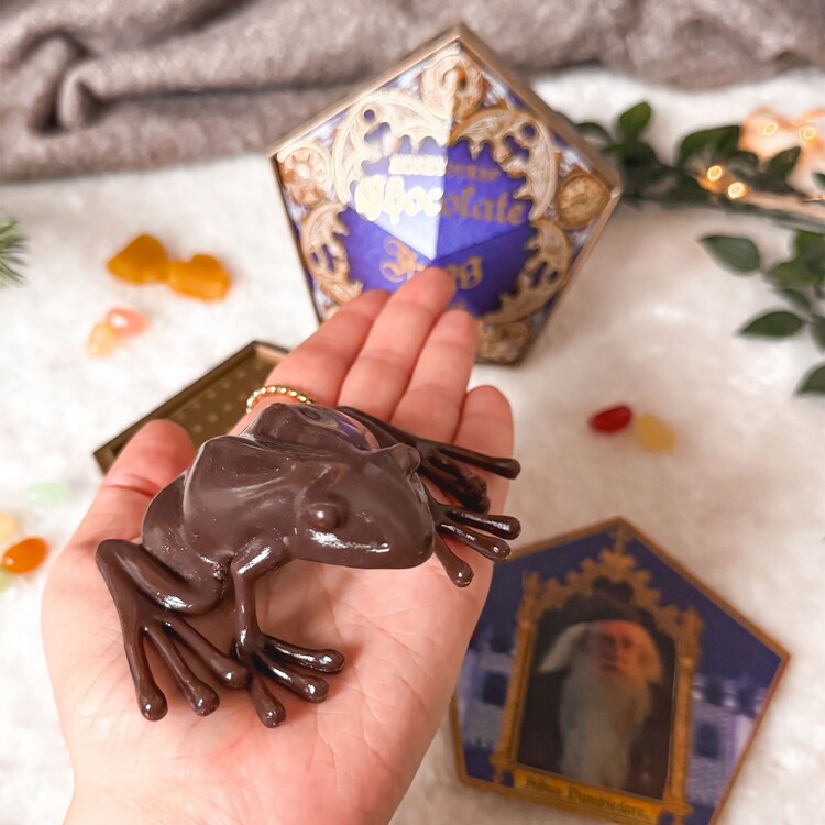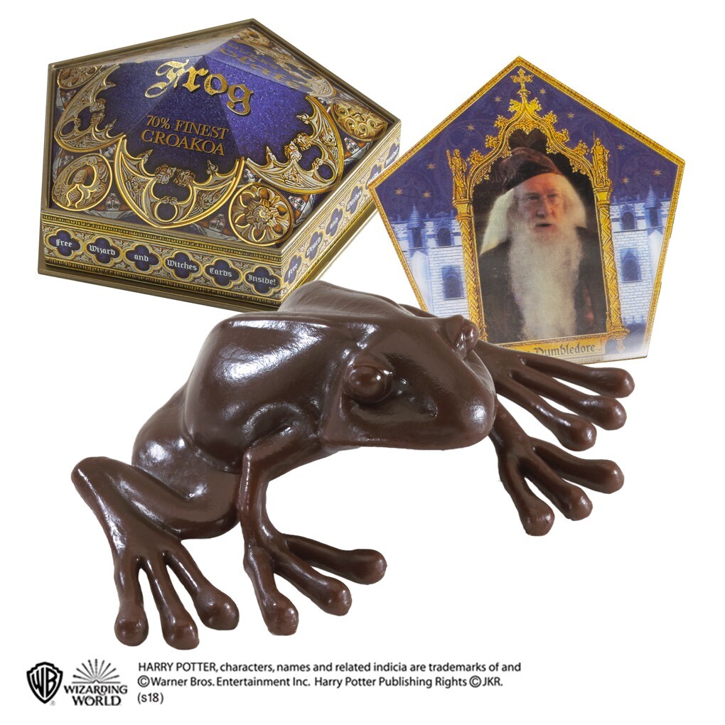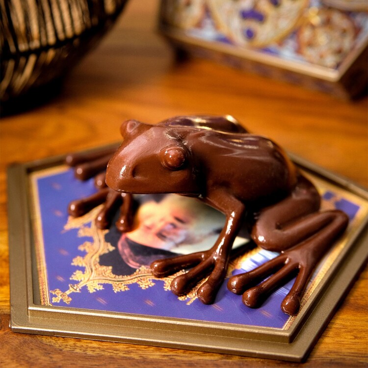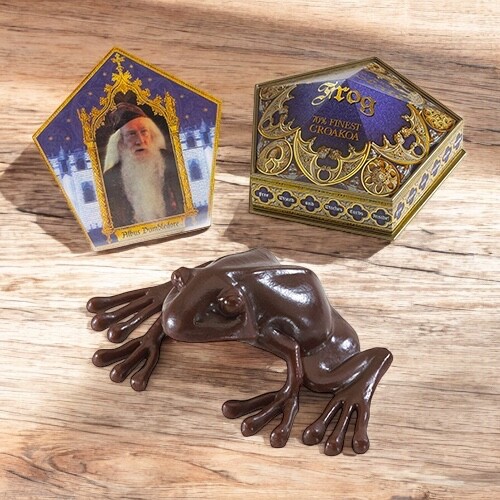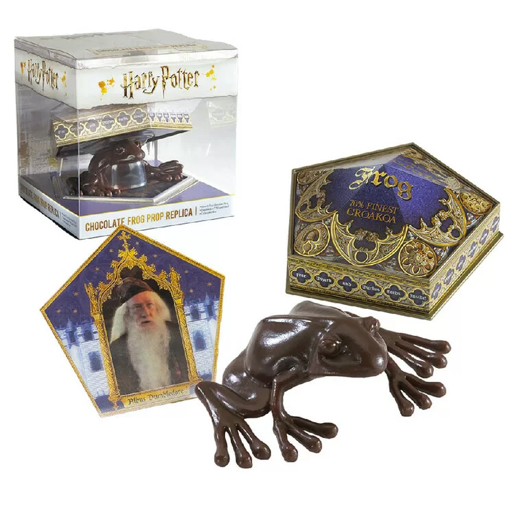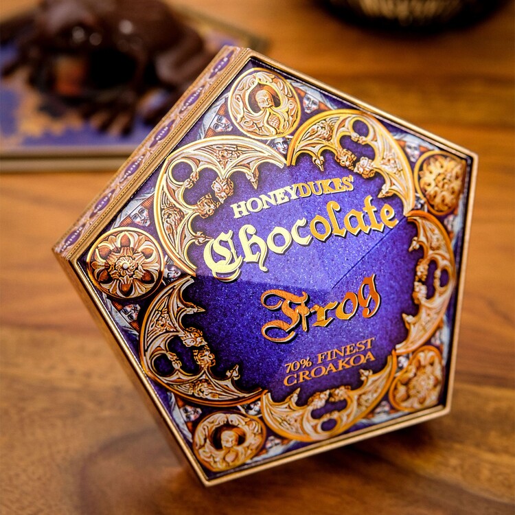 Ova prekrasna replika pakiranja čokoladne žabe Harry Potter sadrži kutiju, karticu Albusa Dumbledorea i čokoladnu žabu koja se može savijati. Kutija je dimenzija 12x12x2,5 cm, a kartica 11x10 cm.