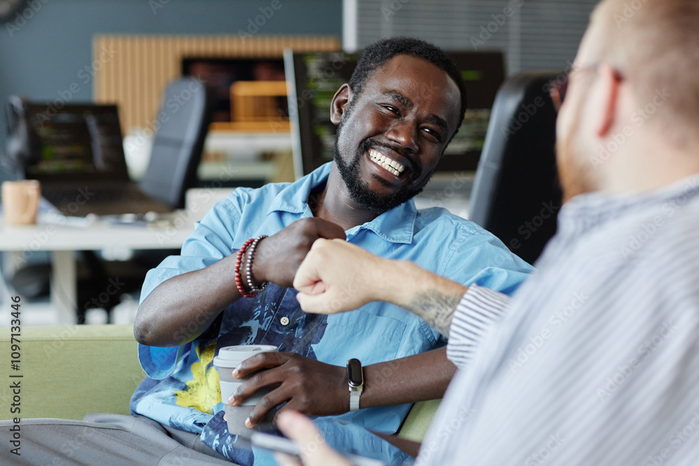 Naljepnica Smiling African American man fist-bumping with colleague while holding coffee cu