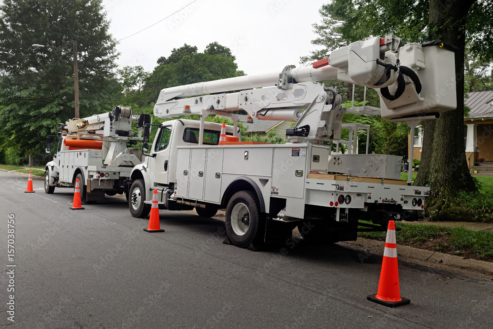 Naljepnica Rear and side view of parked communication utility trucks in residential neighborhood