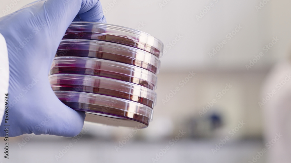 Naljepnica A stack of Petri dishes with red ENDO medium in a scientist's hand, close-up