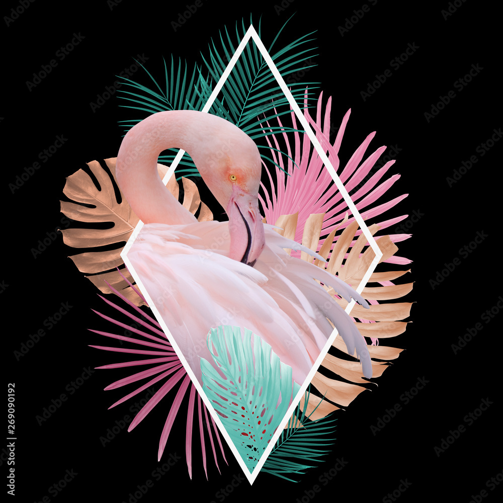 Naljepnica Tropical leaves flamingo design in light pink, golden, turquoise on black, can b