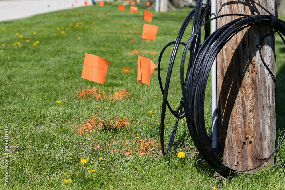 Naljepnica Fiber optic cable, orange marking flags and utility pole