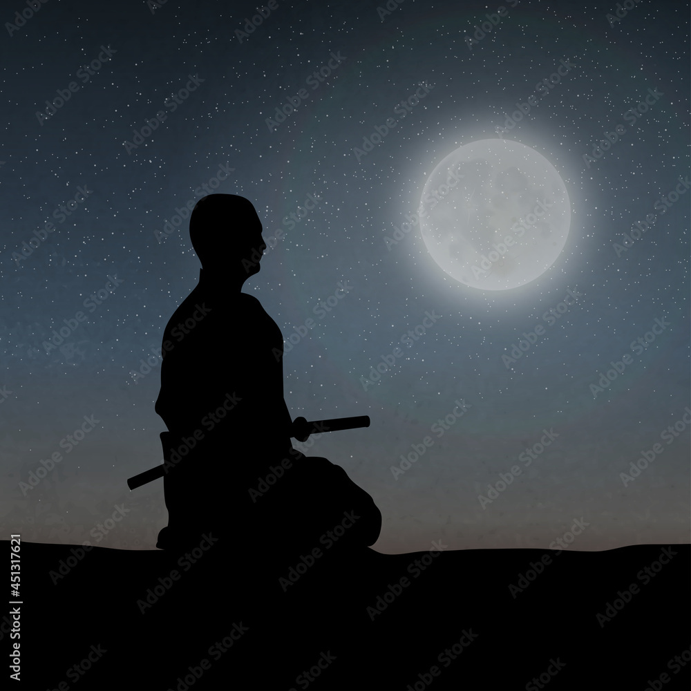 Naljepnica Japanese Swordsman Sitting In Meditation Under The Moonlight