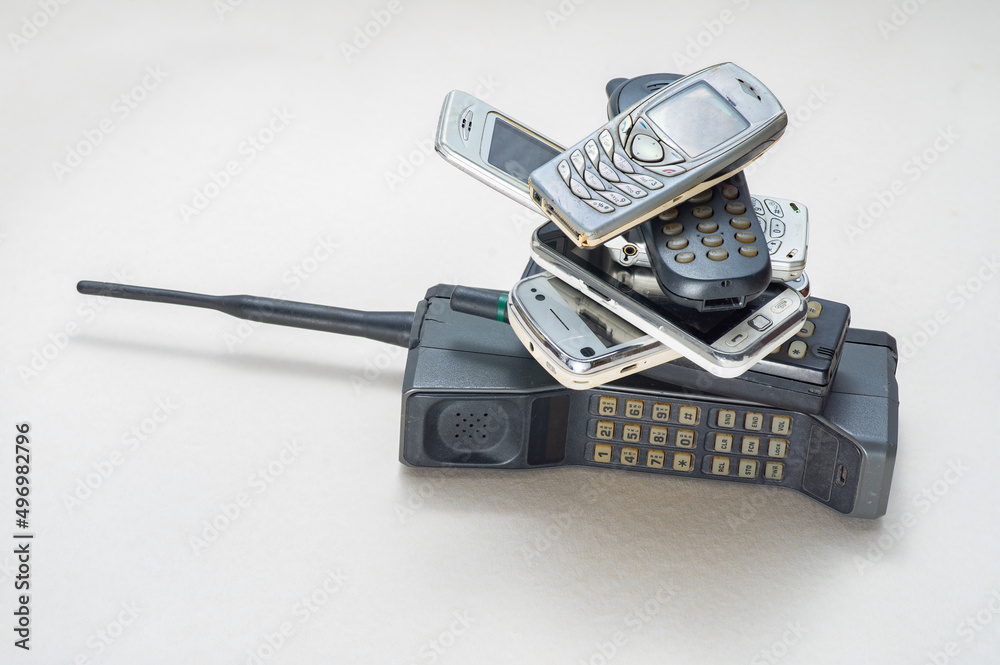 Naljepnica Pile of old and obsolete mobile phones on space of bright and rough background