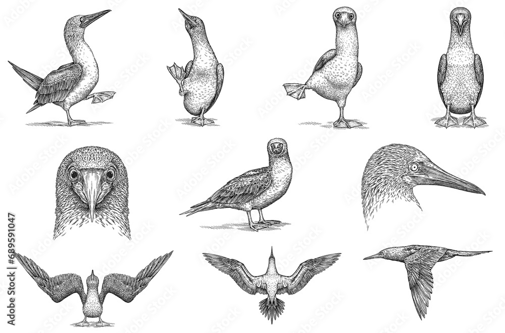 Naljepnica Vintage engraving isolated blue footed booby set illustration ink sketch