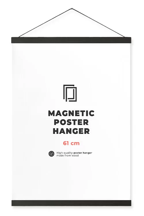 Novi elegantni držači postera bez vijaka i kopči. Drvene vješalice čvrsto drže poster dok ga pričvršćuju malim magnetima u svaku vješalicu. Uzica pričvršćena na gornju stražnju vješalicu koristi se za vješanje uokvirenog postera.