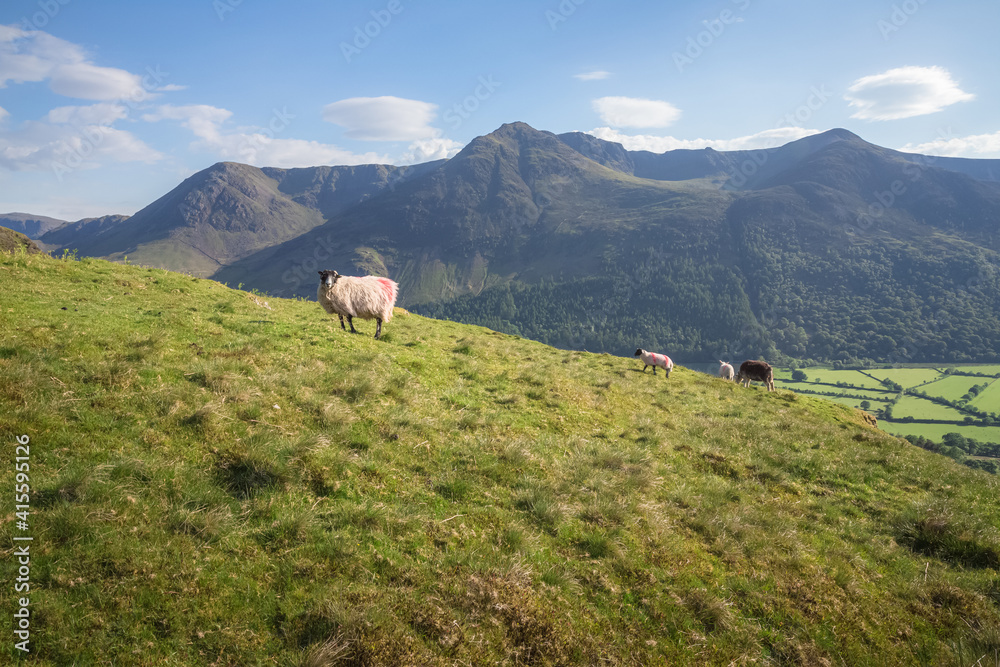 Fotografija Scottish blackface sheep (Ovis Aries) on a hillside in an English countryside landscape with mountain view at Newlands Valley in the Lake District, Cumbria, England