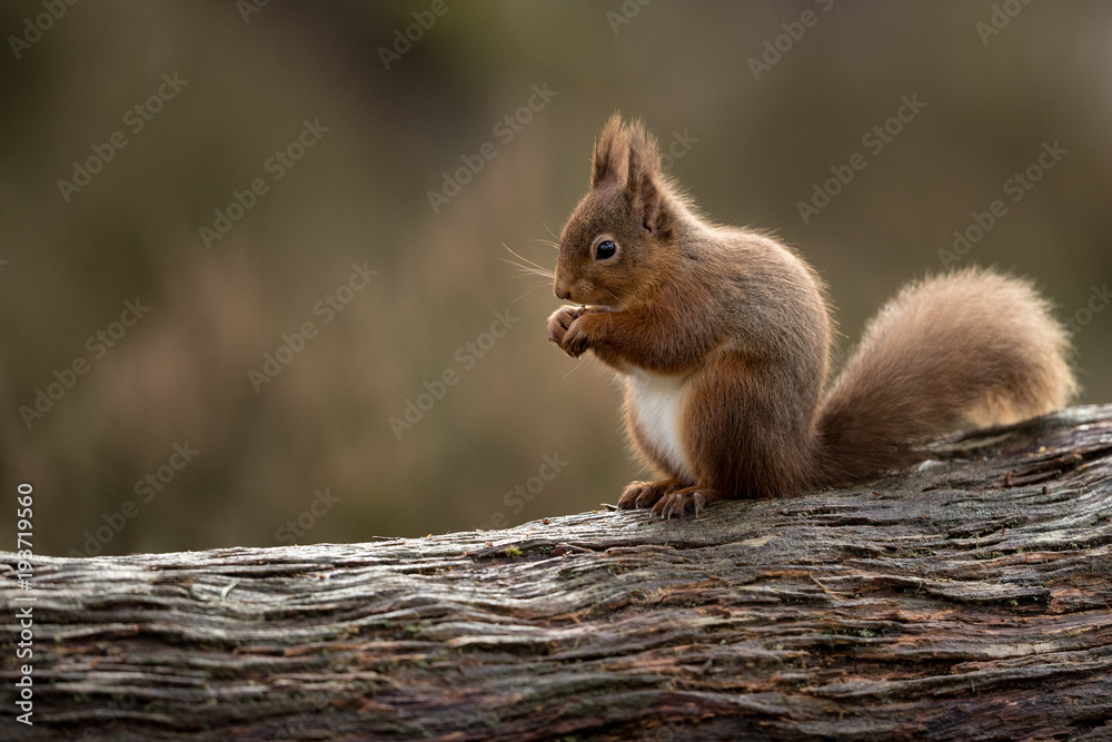 Slika na platnu Red squirrel perched on a side on eating a hazelnut with muted green and brown background