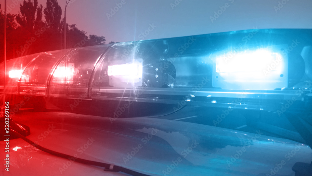 Slika na platnu Emergency vehicle lights flashing, police car inspecting city, security service