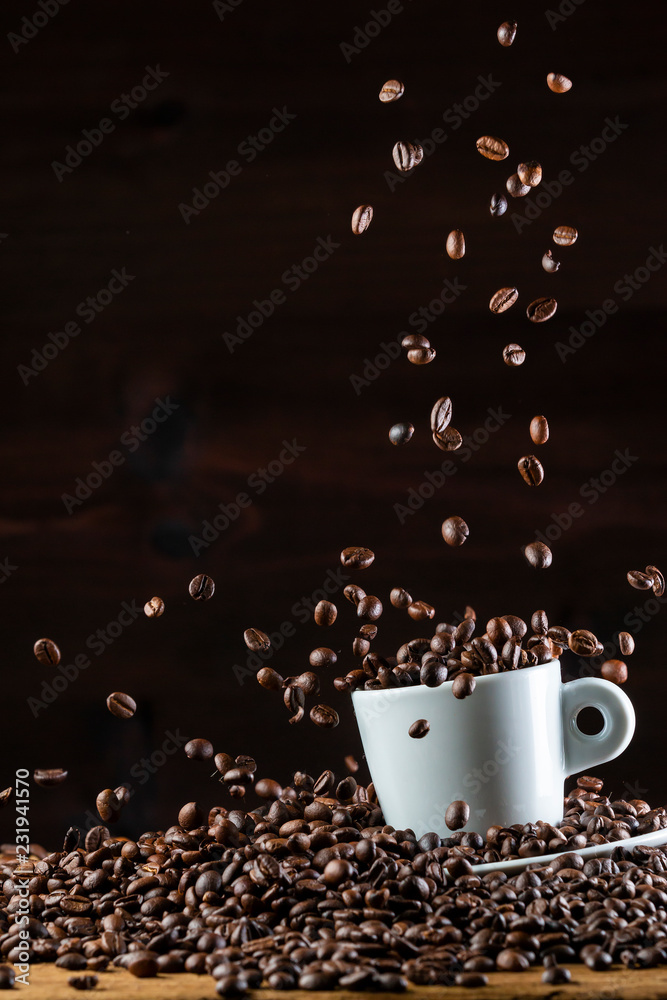 Slika na platnu Roasted coffee beans falling down on white cup on wooden table