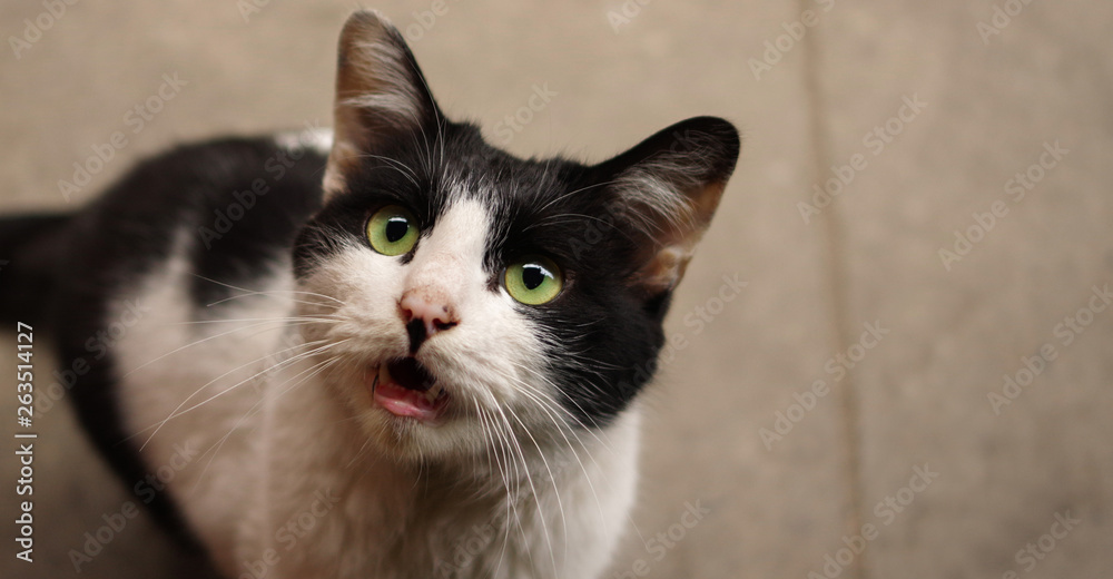Slika na platnu Hungry white black bicolor domestic cat meowing for food