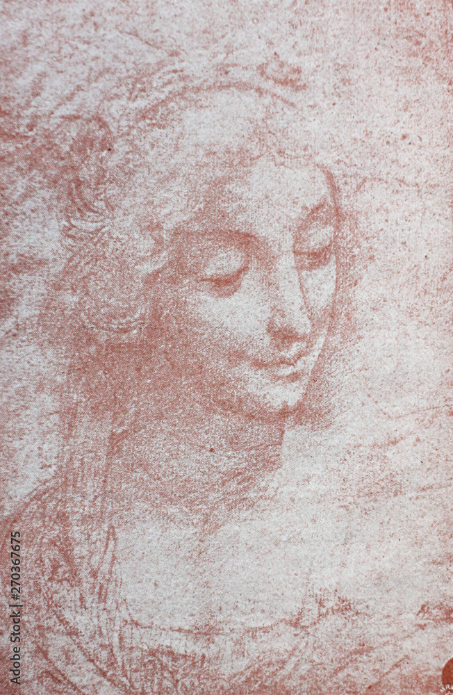 Slika na platnu Etudes of young woman by Leonardo Da Vinci in a vintage book Leonard de Vinci, author A
