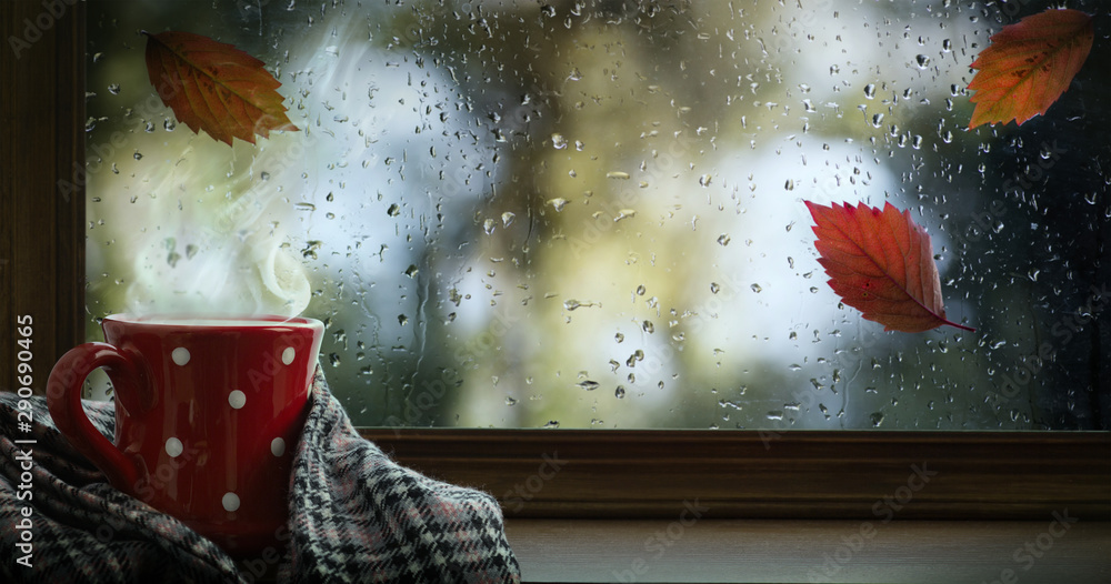 Slika na platnu Autumn season background, red cup with hot drink and wet autumnal window