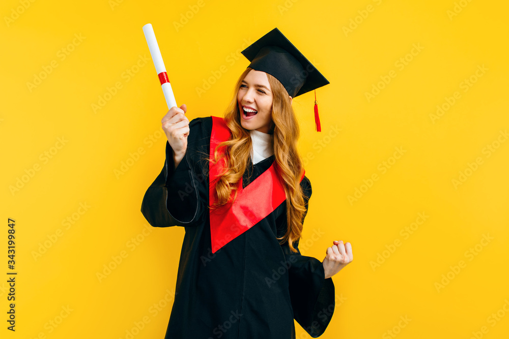 Slika na platnu graduate girl with a diploma, shows a gesture of victory and success, on a yellow background