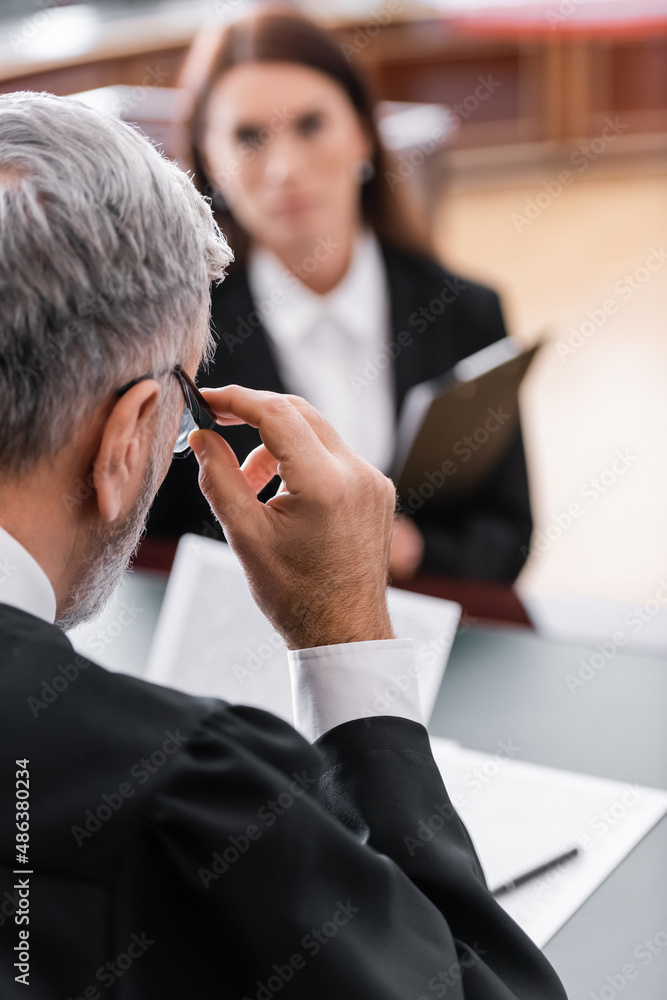 Slika na platnu grey-haired judge adjusting eyeglasses near blurred prosecutor in court