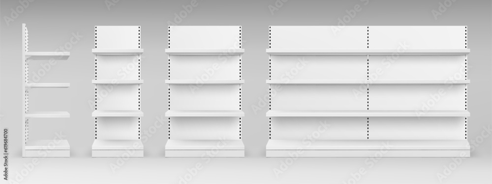 Fotografija Supermarket shelf, white retail shop product shelves and racks, vector empty store showcase displays