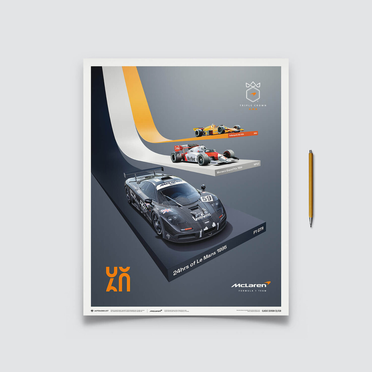 The story of McLaren Racing's Triple Crown dates back to 1974. The first win of the three famed races came at the Indianapolis 500 where McLaren won with their M16D, driven by Johnny Rutherford. The second win came precisely 10 years later at the 1984 Monaco Grand Prix, with Alain Prost sitting behind the wheel of the legendary red and white MP4/2. Acquiring the third crown in 1995, McLaren's F1 GTR shocked everyone at the Circuit de la Sarthe during its first entry at the 24 Hours of Le Mans. With 4 of the entered F1's finishing among the first 5 places, it was the perfect ending to McLaren Racing's Triple Crown dreams.