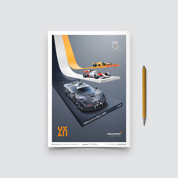 We are thrilled to join McLaren Racing for the celebrations with our special dedicated poster to the historical feat. Depicting all three crowned cars, the poster highlights McLaren's legendary vehicles on a pedestal that also serves as a timeline for the manufacturer's achievement. Sitting on a minimalistic backdrop in McLaren's brand colours, the vehicles are displayed in their full glory. From the race-worn tires to the dirty chassis, the iconic racing machines are captured as if they just crossed the finish line.